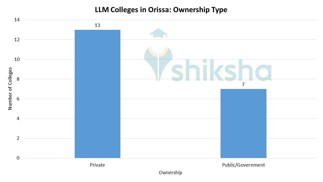 There are 21 Law colleges in Orissa that offer LLM courses. Among them, about 65 percent of them are privately owned and 35 percent of the colleges are owned by the public/government.