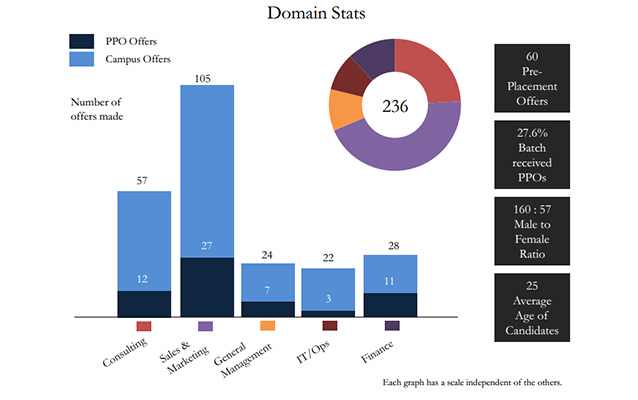 The Boston Consulting Group, Deloitte USI and Accenture Strategy made a total of 24 offers (combined). The Consulting and General Management domains at FMS saw a rise of 25% in the number of offers made. Also, in the E-commerce sector, offers went up by five times. More than 40 offers were made by BFSI companies in Finance domain.