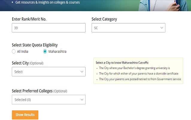 FIND CITY AND COLLEGE: To use this feature of the tool, the aspirant needs to enter his/her rank (in numerals) in the given box and select the Reservation category to which they belong i.e. General/SC/ST or OBC. Thereafter, select State Quota Eligibility –All India or Maharashtra. If you are eligible for Maharashtra state quotas, in the next step you can select ‘City’ as an optional choice. There are three parameters on the basis of which, you can select the city of your choice.