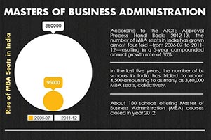 However, the reality is different. Barring a few good B-schools in India, most of MBA colleges are failing on their employment promises. In 2006-07, seats for MBA courses stood at 95,000. It was increased to 3,60,000 in 2011-12. Yet, the campus recruitments have gone down by 40%.