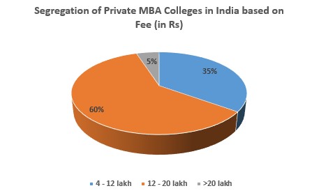 Based on the below pie chart, it can be estimated that pursuing a Private MBA in India from top-rated colleges is expensive. Around 60% of the colleges in India have a course/annual fee that ranges from Rs 12-20 lakh. Some of these colleges are: