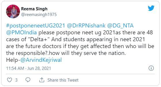 Another user requested the Delhi Chief Minister to assist medical aspirants in deferring NEET 2021 due to 48 incidences of Delta+ (plus).