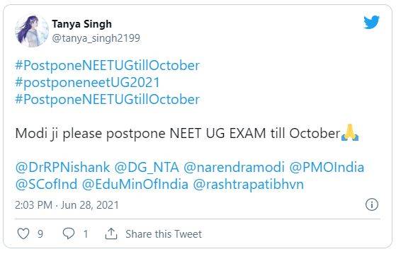 Meanwhile, medical students have taken to Twitter to petition the NTA and Education Minister Ramesh Pokhriyal 'Nishank' to postpone the NEET entrance test until October. Several recent tweets are included here.