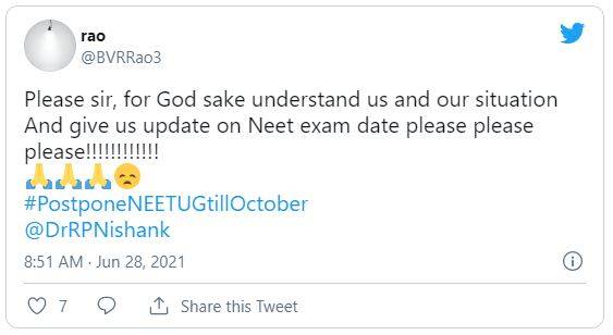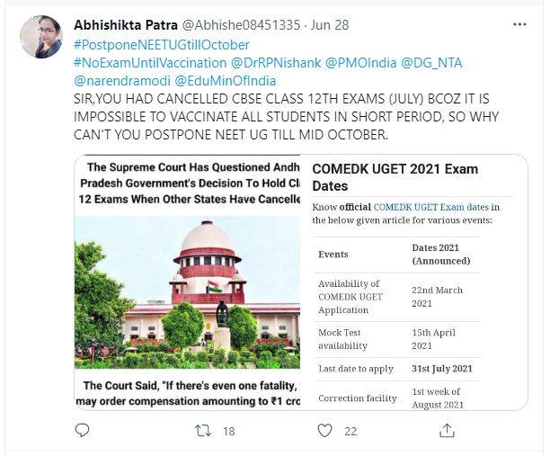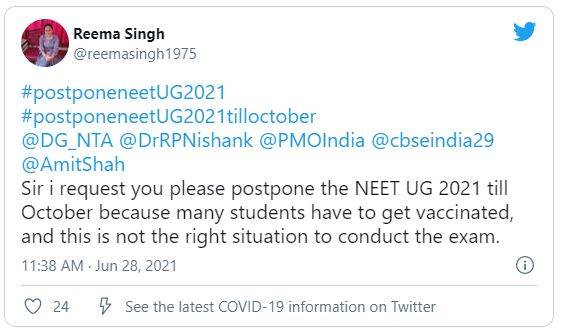 “Sir, you have cancelled CBSE Class 12 examinations (July) since it is difficult to vaccinate all kids in a short period of time, therefore why can't you postpone NEET-UG until mid October?” a medical aspirant tweeted, questioning the officials.''