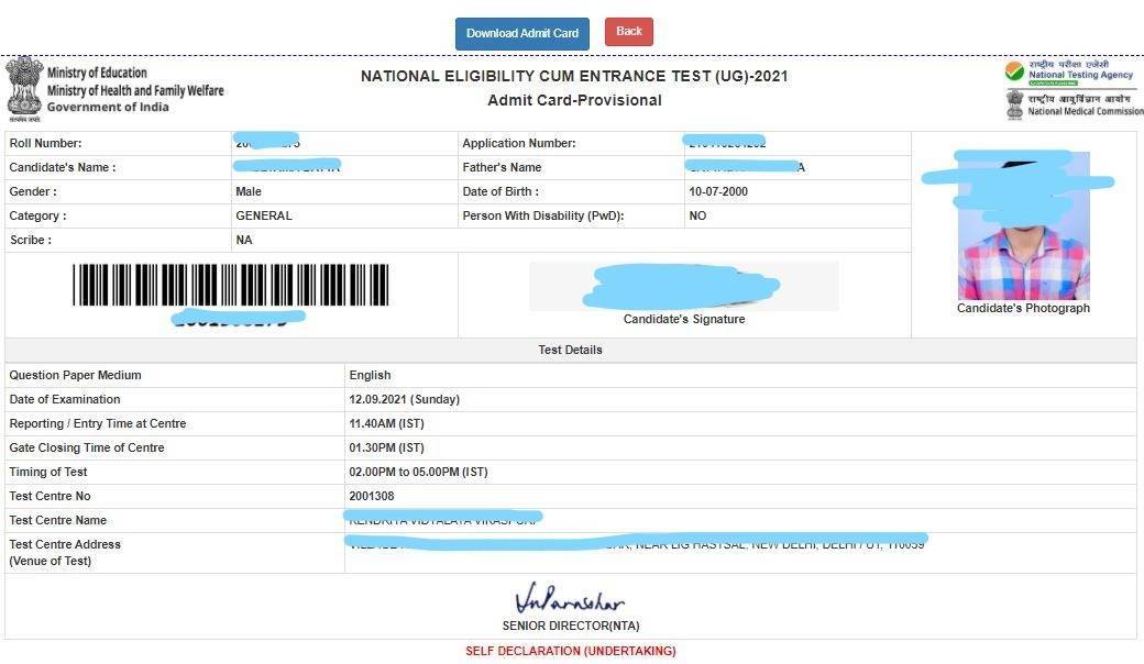 NEET प्रवेश पत्र 2021 पर उल्लेखित विवरण