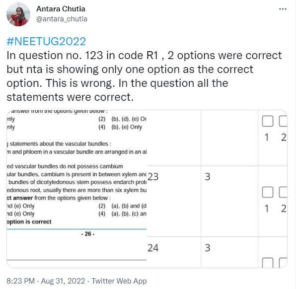 Antara, another candidate stated, “In question no. 123 in code R1 , 2 options were correct but nta is showing only one option as the correct option. This is wrong. In the question all the statements were correct.”