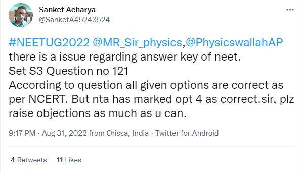 Sanket Acharya, another student wrote, “There is a issue regarding answer key of neet. Set S3 Question no 121 According to question all given options are correct as per NCERT. But nta has marked opt 4 as correct.sir, plz raise objections as much as u can.”