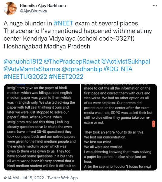 NEET 2022: Controversies never cease to mar the National Eligibility cum Entrance Test (NEET). With the conclusion of the exam on July 17, several candidates reported goof-ups regarding the NEET 2022 question paper distribution. Reportedly, at some of the NEET exam centres of Rajasthan and Madhya Pradesh, the question papers in Hindi and English were interchanged among candidates while distributed. Although they were given extra time, but this incident caused them inconvenience and hampered their focus and concentration.