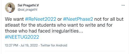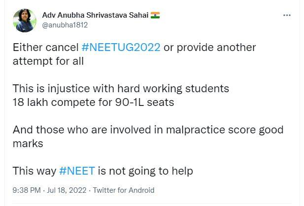 Advocate Anubha Shrivastava Sahai has tweeted, “Either cancel #NEETUG2022 or provide another attempt for all This is injustice with hard working students 18 lakh compete for 90-1L seats And those who are involved in malpractice score good marks This way #NEET is not going to help #reneet2022 #neetug2022”