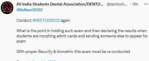 The All India Students Dental Association (AISDA) tweeted, “Conduct #NEETUG2022 again What is the point in holding such exam and then declaring the results when students are morphing admit cards and sending someone else to appear for exam With proper Security & biometric this exam must be re conducted.”