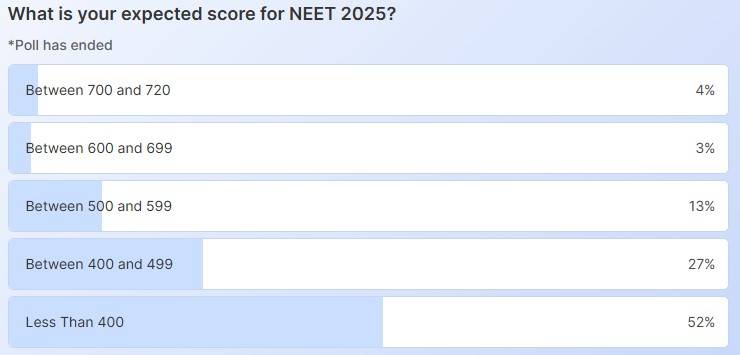 Shiksha.com ran a poll with the question, ‘What is your expected score for NEET 2025?’. The majority of the votes received indicates that over 50 per cent of the respondents are estimating a score below 400. On the other hand, only four per cent are expecting a NEET 2025 score in the range of 700 to 720.