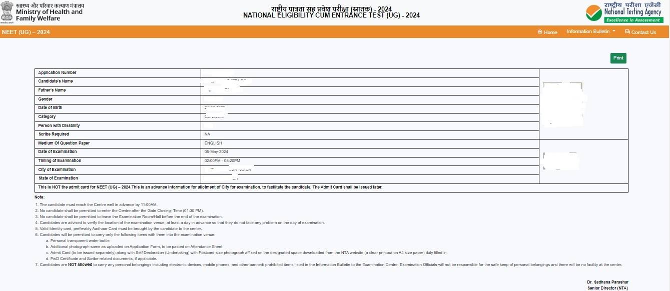 Contents of NEET Advance City Intimation Slip