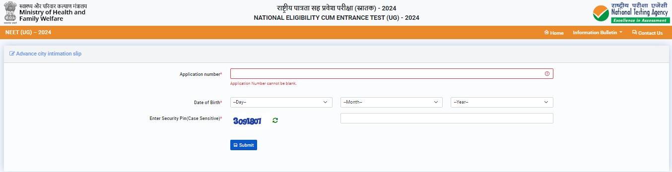- Visit the official website of NEET 2024 – neet.ntaonline.in or directly enter the link https://neet.ntaonline.in/frontend/web/advancecityintimationslip/index