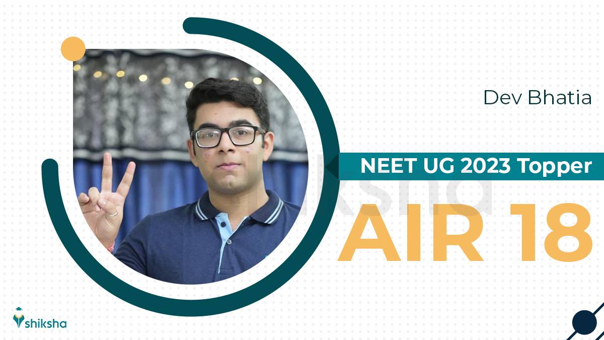 NEET UG 2023 Topper Dev Bhatia secured a total of 715 scores out of 720. With All India Rank 18, Bhatia wants to join his dream medical institute, AIIMS Delhi and aspires to become a neurosurgeon. National Testing Agency (NTA) declared NEET 2023 result on June 13. Son of a Chartered Accountant, Dev told Shiksha.com that he always had high expectations with his NEET-UG results. In an exclusive interview with us, Bhatia talked about his NEET-UG preparation strategy, exam technique, career plans and more. Dev also shared some important points for candidates aspiring to appear for the medical entrance exam NEET-UG. Check out some important excerpts from the interview below: