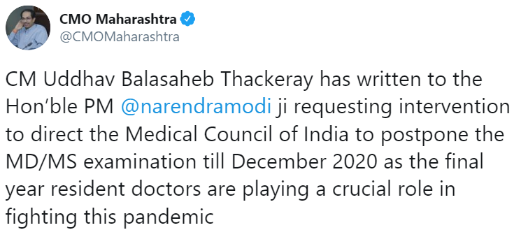 In the letter, Mr Thackarey requested PM to direct the medical council of India to postpone the exams to be conducted by the Maharashtra University of Health Sciences, MUHS, Nashik. These PG Medical exams were to commence from July 15, 2020.