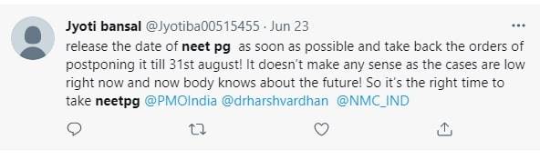 One of the aspirants said, “Release the date of NEET PG as soon as possible and take back the orders of postponing it till 31st august! It doesn’t make any sense as the cases are low right now and nobody knows about the future! So it’s the right time to take NEET PG.”