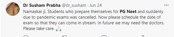 Please schedule the exam date to bring back doctors in the stream. In the future, we may need them, a tweet from Dr Sushma Prabha said.