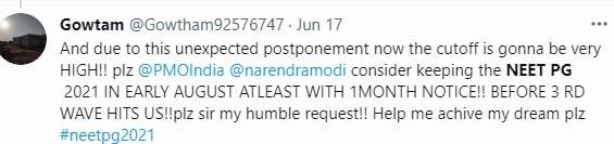 “Due to this unexpected postponement now the cutoff is gonna be very high!! plz consider keeping the NEET PG 2021 in early August before 3rd wave hits us. Plz, sir my humble request!! Help me achive my dream plz,” another aspirant tweeted tagging Prime Minister Narendra Modi.