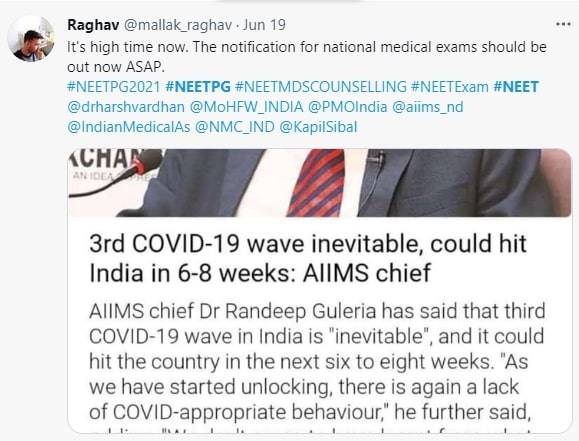 In this light, NEET PG 2021 candidates are making a strong appeal to prepone the schedule before August 31. They appeal to conduct NEET PG 2021 exam in early August. One of the students said that the public will face major frustration due to a shortage of doctors if the third wave strikes.