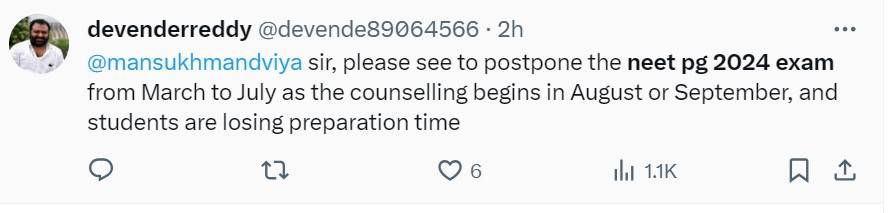 Some of the candidates seem to have supported NEET PG 2024 exam postponement news reports while others have opposed the move. One of the students say when NEET can be held in May and INI CET too, why NEET PG is being postponed. Check some of the reactions of students on X (Twitter):