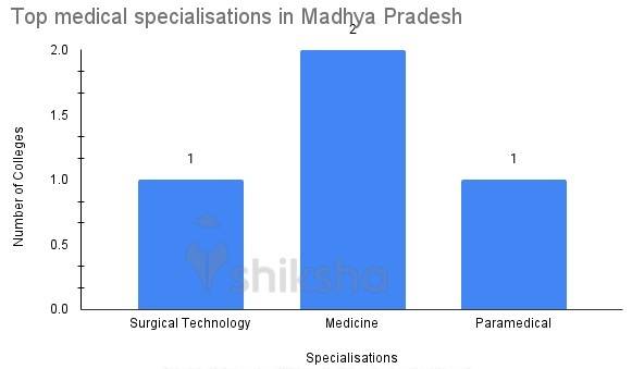 The top MBBS specialisations offered by the medical colleges in Madhya Pradesh are Surgical Technology, Medicine, and Paramedical.