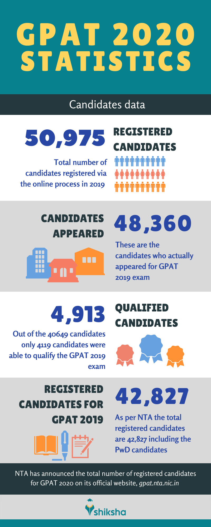 NTA has released the stats regarding the number of candidates registered for GPAT 2020 on January 27, 2020 on their official website. The number of registered candidates were 50,975 and the actual number of candidates appeared were 48,360. The exam was concluded on January 28, 2021 (2:30 PM to 5:30 PM). Hence, we have gathered some statistics from the last year mentioned in the infographic below.
