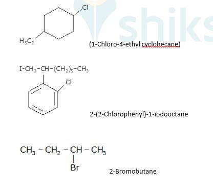 A 10.1 From the name of the compound it is clear that the parent ring is pentane and chloro and methyl groups are attached in the straight chain at 2nd and 5th position respectively. Hence, the structure is as follows: From the name of the compound given it is clear that the parent group is hexane with 2 attachments namely chloro and ethyl groups at 1 and 4 positions respectively. Hence, the structure is as follows: - From the name of the compound given it is clear that the parent group is heptane with tertiary butyl and iodine groups attached at 4 and 3 positions respectively. Hence, the structure is as follows: - From the name of the compound given it is clear that the parent group is an alkene with the unsaturation present in between 2nd and 3rd carbon and 2 bromine atoms attached at 1st and 4th carbon. Hence, the structure is as follows : - From the name of the compound given it is clear that the parent group is benzene with bromine group attached at 1st carbon, secondary butyl group attached at 4th carbon and a methyl group attached at 2nd carbon. Hence, the structure is a follows : - |
