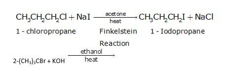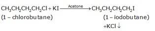 (b) The conversion of 1-chlorobutane to 1-iodobutane simply takes place by treating the reactant with KI in the presence of acetone. The iodine from KI normally replaces the chlorine from the reactant and gives 1-iodobutane as the final product with KCl as the by product.
