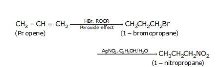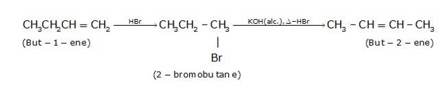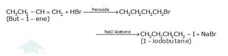 (c) The conversion of but-1-ene to 1-iodobutane takes place according to anti-markovnikoff (positive charged ion H+ goes to the carbon which has less number of hydrogens and negative part Br- goes to the carbon which has more number of hydrogens.) i.e. the attack of HBr on but-1-ene in the presence of peroxide gives 1-bromobutane as the intermediate which on treatment with NaI+Acetone gives 1- iodobutane as the final product and NaBr as the by-product.