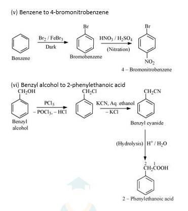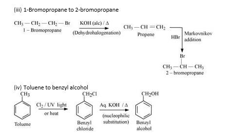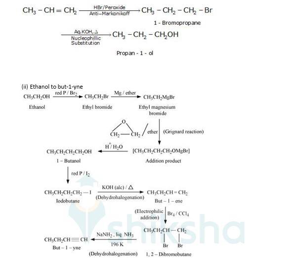 10.19 How the following conversions can be carried out? (i) Propene to propan-1-ol (ii) Ethanol to but-1-yne (iii) 1-Bromopropane to 2-bromopropane (iv) Toluene to benzyl alcohol (v) Benzene to 4-bromonitrobenzene (vi) Benzyl alcohol to 2-phenylethanoic acid (vii) Ethanol to propanenitrile (viii) Aniline to chlorobenzene (ix) 2-Chlorobutane to 3, 4-dimethylhexane (x) 2-Methyl-1-propene to 2-chloro-2-methylpropane (xi) Ethyl chloride to propanoic acid (xii) But-1-ene to n-butyliodide (xiii) 2-Chloropropane to 1-propanol (xiv) Isopropyl alcohol to iodoform (xv) Chlorobenzene to p-nitrophenol (xvi) 2-Bromopropane to 1-bromopropane (xvii) Chloroethane to butane (xviii) Benzene to diphenyl (xix) Tert-Butyl bromide to isobutyl bromide (xx) Aniline to phenylisocyanide
