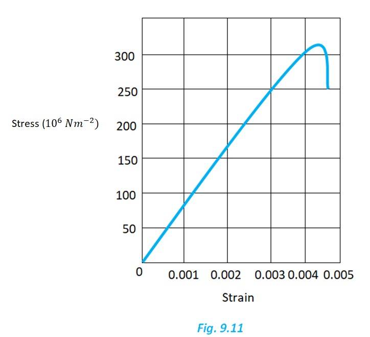Q.9.2 Figure 9.11 shows the strain-stress curve for a given material. What are (a) Young’s modulus and (b) approximate yield strength for this material? |