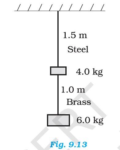 9.5 Two wires of diameter 0.25 cm, one made of steel and the other made of brass are loaded as shown in Fig. 9.13. The unloaded length of steel wire is 1.5 m and that of brass wire is 1.0 m. Compute the elongations of the steel and the brass wires.