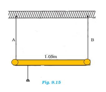 9.18 A rod of length 1.05 m having negligible mass is supported at its ends by two wires of steel (wire A) and aluminium (wire B) of equal lengths as shown in Fig. 9.15. The cross-sectional areas of wires A and B are 1.0 mm2 and 2.0 mm2, respectively. At what point along the rod should a mass m be suspended in order to produce (a) equal stresses and (b) equal strains in both steel and aluminium wires.