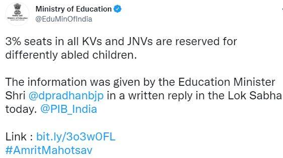 Union Minister of Education, Dharmendra Pradhan in a written reply in the Lok Sabha informed that 3 percent seats of total available seats for fresh admissions in Kendriya Vidyalayas (KVs) and Jawahar Navodaya Vidyalayas (JNVs) are horizontally reserved for differently-abled children. According to the official press release shared by the education minister, the government has implemented various measures for differently-abled children in KVs& JNVs such as “Barrier free access for differently-abled students is an integral part of Vidyalaya building design. Ramps and special toilets are constructed in schools as well as hostel buildings, trained teachers to help the students, services of Special Educators to facilitate the teaching-learning process among differently-abled children, need-based procurement of assistive augmented devices.”