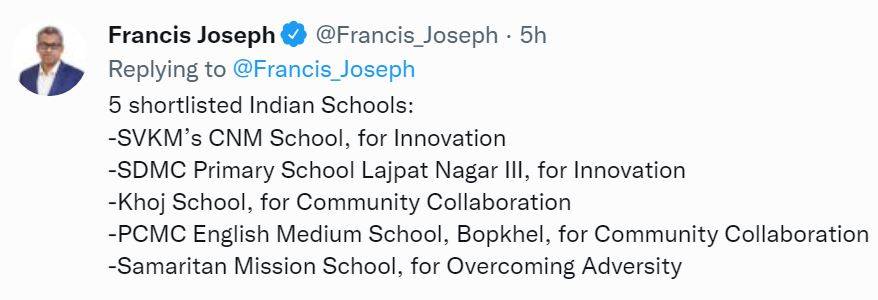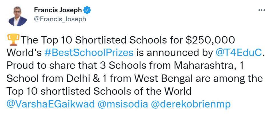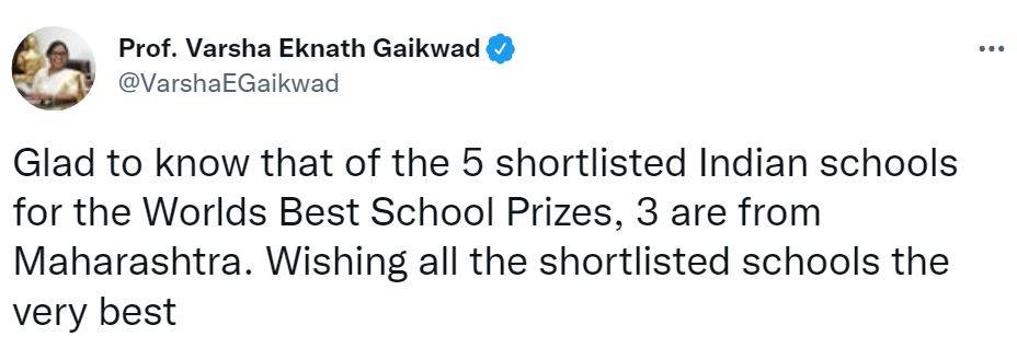 Overwhelmed by the news, Maharashtra education minister shared congratulatory wishes through her official Twitter handle. The minister said, “Glad to know that of the 5 shortlisted Indian schools for the Worlds Best School Prizes, 3 are from Maharashtra. Wishing all the shortlisted schools the very best.”