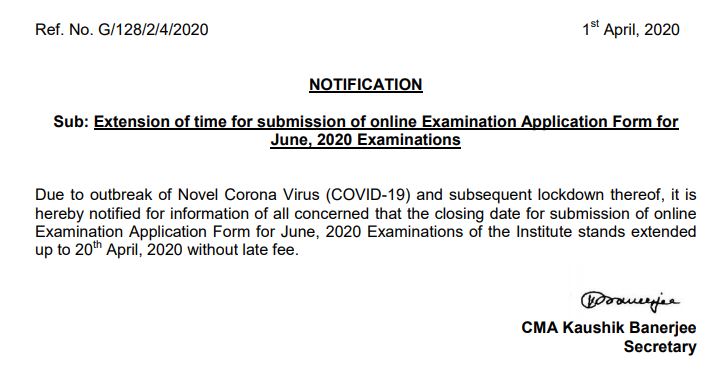 The Institute of Cost Accountants of India (ICAI) has extended the last date of application ICWAI June 2020 examinations. The candidates applying for ICWAI courses including, Foundation, Intermediate and Final courses, can now fill and submit the application form until April 20, 2020. Earlier, the application window for ICWAI June 2020 examinations was to be closed on April 10. However, it has been extended due to the Coronavirus outbreak in India as per the latest notification published on April 1, 2020.