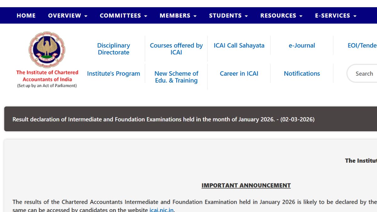 To download result candidates will have to enter their login credentials - registration number and roll number. CA Intermediate Exam January 2026 was conducted between January 06 and January 17, 2026. CA Foundation Exam January 2026 was conducted between January 18 and January 24, 2026.