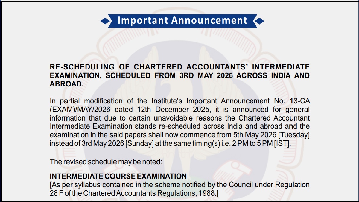 The Institute of Chartered Accountants of India has changed the exam dates for CA Intermediate May 2026 session. Earlier, the CA Inter exams were scheduled to begin on May 03. Per the official notice, the CA Inter exam for May 2026 has been rescheduled and will now begin on May 05, 2026. The notice also states that, 'The schedule of other examinations i.e. Foundation, Final and PQC [INTT – AT] notified vide Important Announcement No. 13-CA (EXAM)/MAY/2026 dated 12th December 2025, shall remain unchanged."