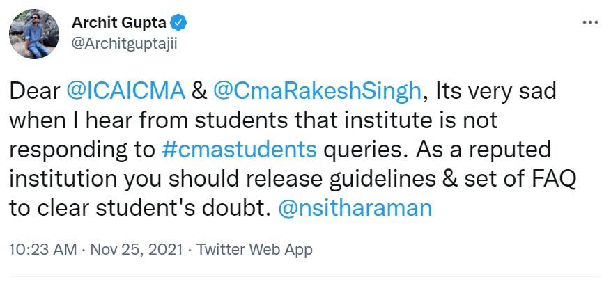Dear @ICAICMA & @CmaRakeshSingh, Its very sad when I hear from students that institute is not responding to #cmastudents queries. As a reputed institution you should release guidelines & set of FAQ to clear student's doubt.