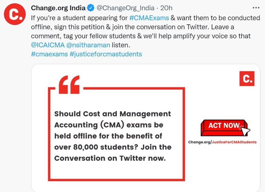 If you're a student appearing for #CMAExams & want them to be conducted offline, sign this petition & join the conversation on Twitter. Leave a comment, tag your fellow students & we'll help amplify your voice so that