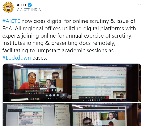 The tweet posted by the AICTE reads, “#AICTE now goes digital for online scrutiny & issue of EoA. All regional offices utilizing digital platforms with experts joining online for the annual exercise of scrutiny. Institutes joining & presenting docs remotely, facilitating to jumpstart academic sessions as #Lockdown eases.”