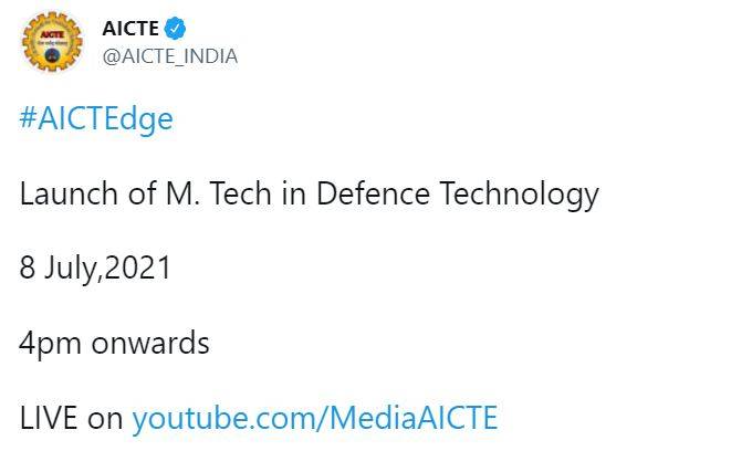 All India Council for Technical Education (AICTE), the technical education regulator has launched an MTech programme in Defence Technology today, i.e. July 8, 2021, in a virtual mode. According to the official information released by the council, the postgraduate degree programme will offer specialisations in combat vehicle engineering, aerospace technology, communication systems and sensors, directed energy technology, naval technology and high energy materials technology.