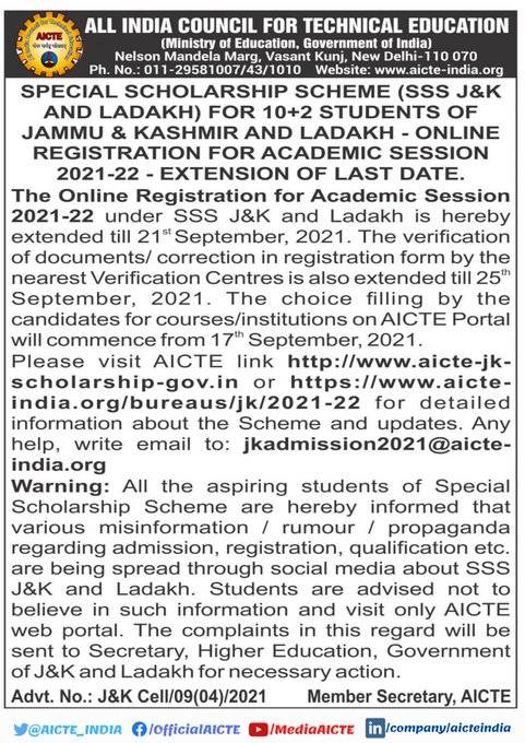 AICTE Special Scholarship Scheme: Online registration process for AICTE Special Scholarship Scheme is all set to end today, i.e. September 21, 2021. AICTE through its official Twitter handle informed, “Today is the last date for #Online registration for Academic Session 2021-22 under Special #Scholarship Scheme (SSS) for 10+2 students of UTs of Jammu & Kashmir and Ladakh.”