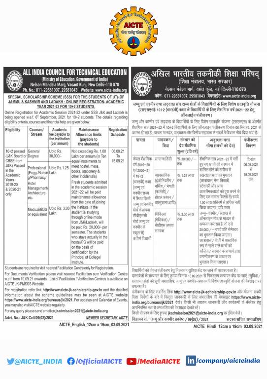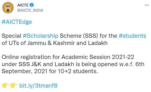 The All India Council for Technical Education (AICTE) commenced the online registration for the Special Scholarship Scheme (SSS) for the Class 12 pass students of Jammu and Kashmir, Ladakh for the 2021-22 academic year on September 6, 2021. AICTE announced on social media. “Special #Scholarship Scheme (SSS) for the #students of UTs of Jammu & Kashmir and Ladakh. Online registration for Academic Session 2021-22 under SSS J&K and Ladakh is being opened w.e.f. 6th September, 2021 for 10+2 students,” AICTE said in a social media post.