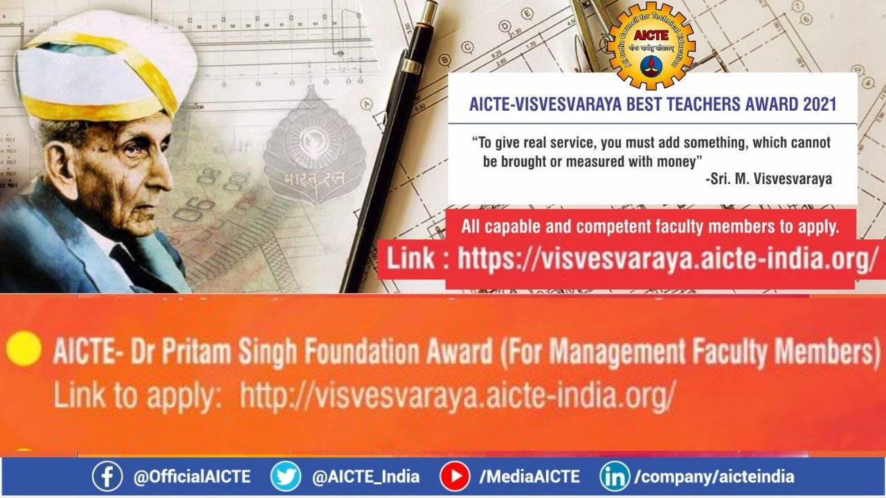 AICTE Visvesvaraya Best Teachers Award: The last date for application submission of 'AICTE-Dr Pritam Singh Foundation Award (for management faculty)’ has been extended until August 20, 2021. The Council introduced this scheme to identify the extraordinary teachers and recognize the excellence / best practices/innovativeness of such teachers in the field of technical education at the national level for Degree and Diploma institutions. The official notice released by the Council regarding the Visvesvaraya Best Teachers Award reads, “This scheme is aimed to recognize the meritorious faculties on Teachers Day i.e., September 5, 2021, every year at National level and encourage them to update themselves to the ever-changing needs of higher education at global level and thereby becoming an effective contributor towards the society.”