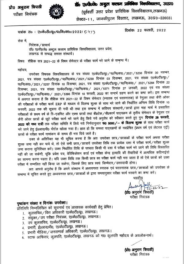 Dr APJ Abdul Kalam Technical University (AKTU) has reopened the AKTU odd semester undergraduate (UG) and postgraduate (PG) exam form submission window. Students who could not submit the AKTU application form can do it till February 28, 2022 with a late fee of INR 5,000.