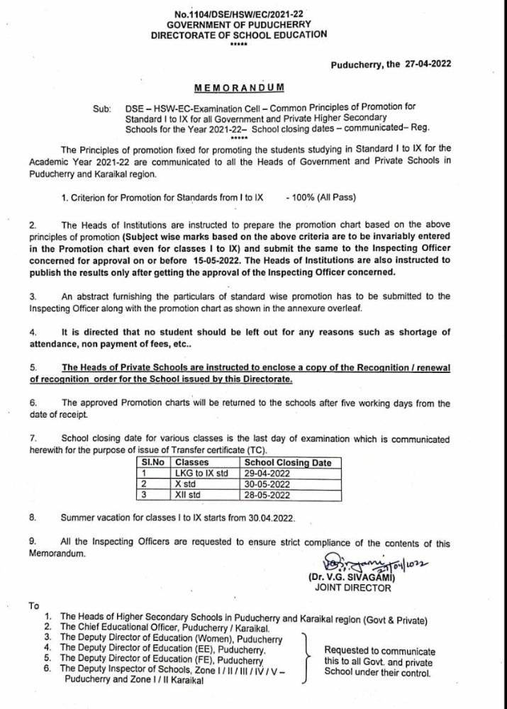 Directorate of School Education, Puducherry has announced its decision to promote all students of Classes 1 to 9 for the academic year 2021-22. Through an official notice, the Puducherry government has directed the heads of all private and public schools of Pondicherry and Karaikal area to ‘pass’ all the students of Classes 1 to 9. In addition, the government has announced that summer holidays for students of Classes 1 to 9 would begin from April 30, 2022.