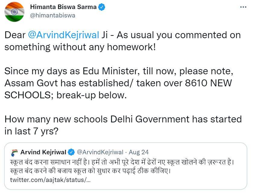 Giving a befitting reply to Delhi Chief Minister Arvind Kejriwal, Assam CM Himanta Biswa Sarma asked him to do his homework properly. The reply came when Delhi CM said, “Closing schools is not the solution. We just need to open many new schools all over the country. Instead of closing the school, improve the school and make education right.”