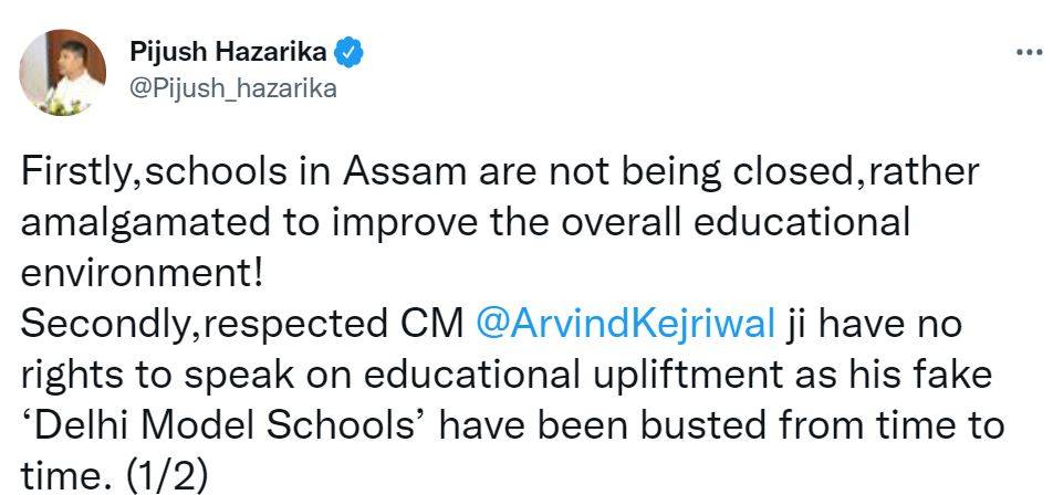 Further countering Kejriwal's tweet, Assam Minister Pijush Hazarika wrote on his official Twitter handle, "Firstly, schools in Assam are not being closed, rather amalgamated to improve the overall educational environment! Secondly, respected CM @ArvindKejriwal ji have no rights to speak on educational upliftment as his fake 'Delhi Model Schools' have been busted from time to time."