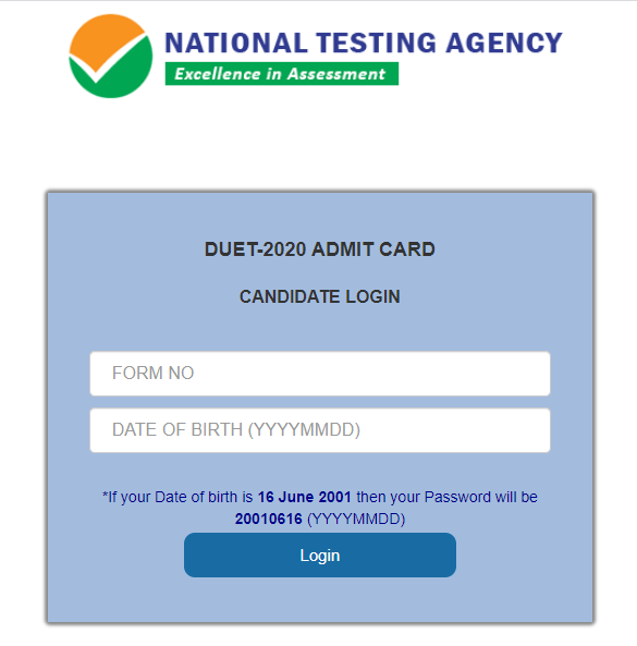 In case any candidate faces difficulty in downloading the Admit Card, or need to update or correct any information on the admit card, s/he can contact on following numbers 8287471852, 8178359845, 9650173668, 9599676953 and 8882356803 or mail at duet@nta.ac.in.